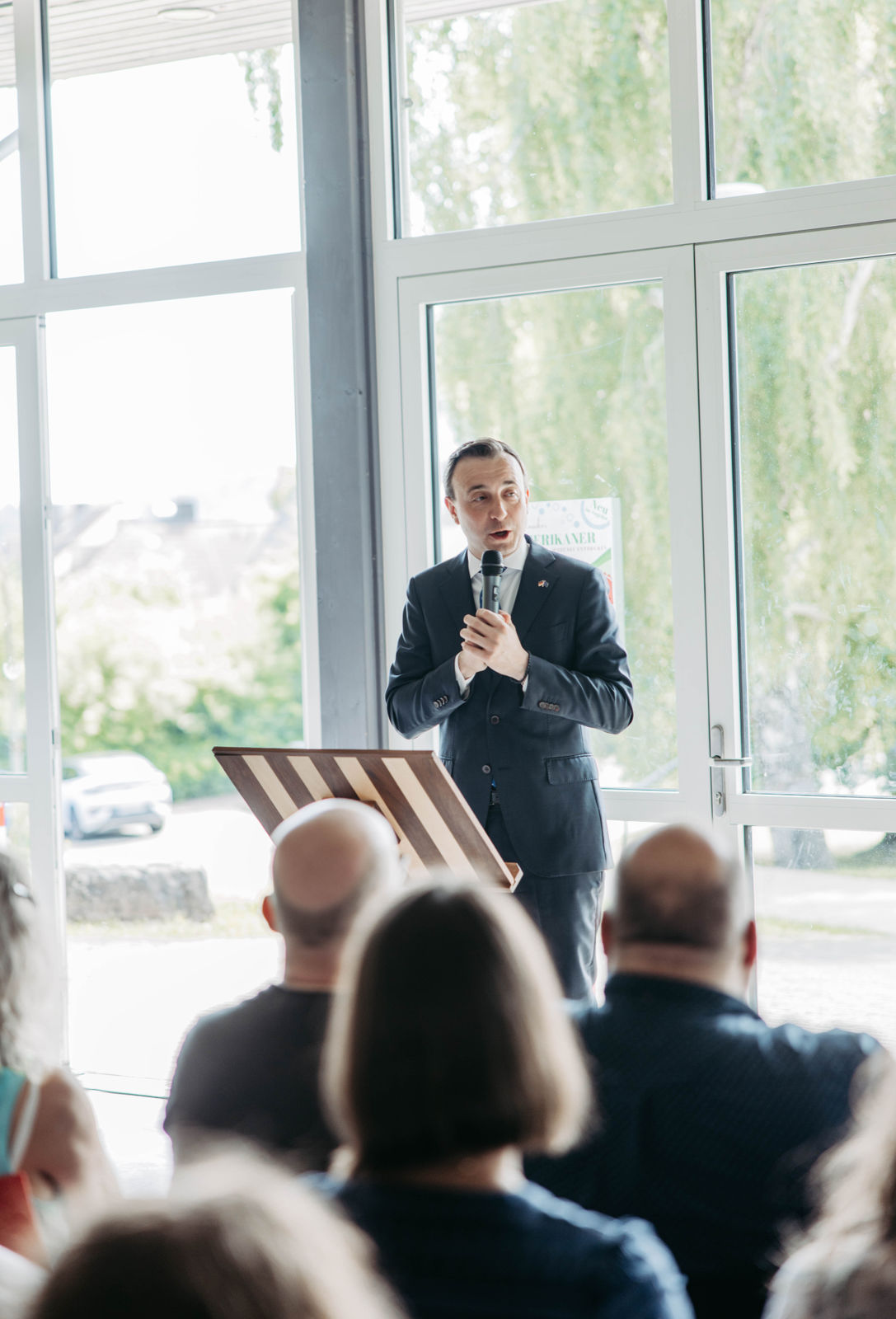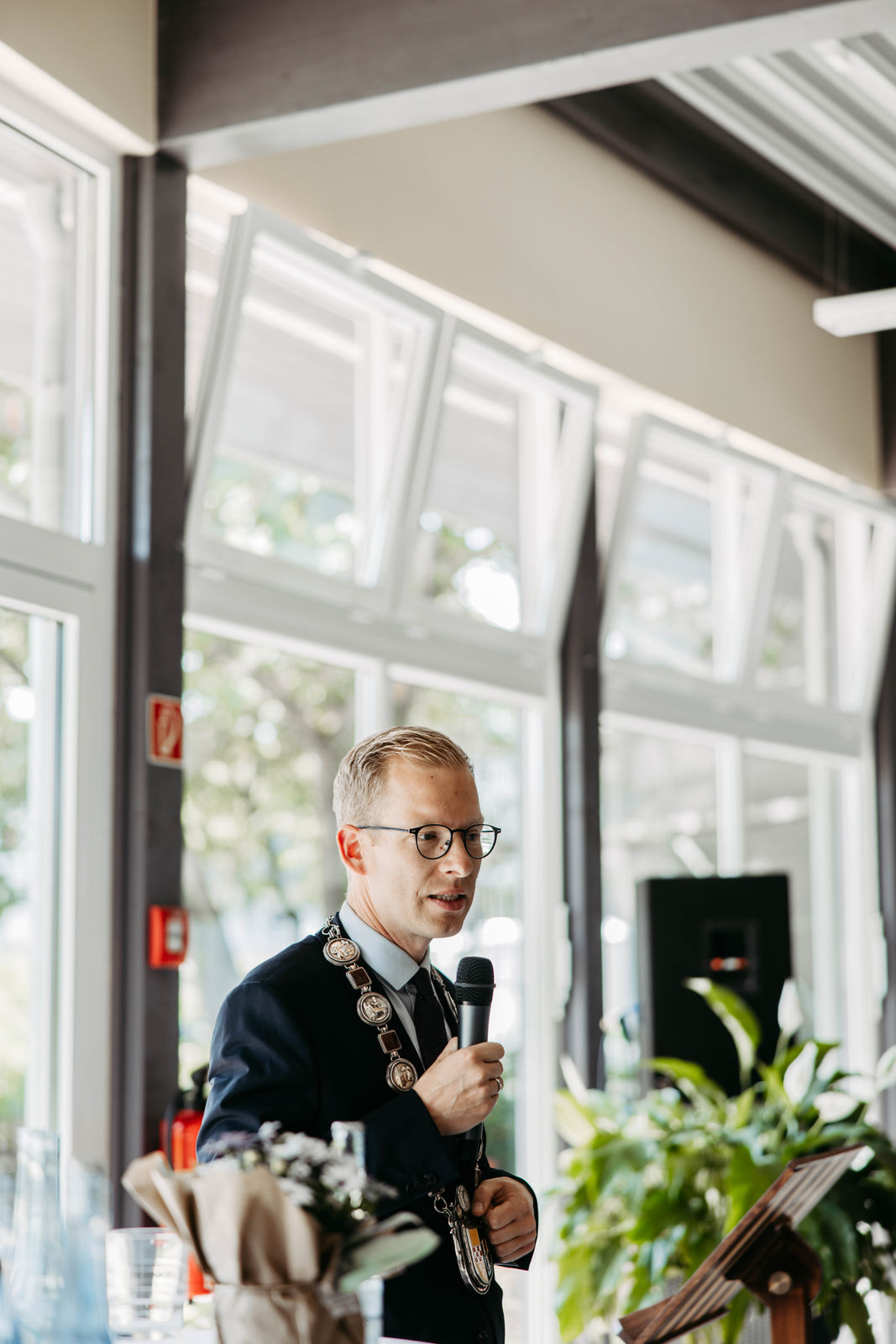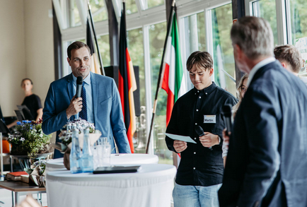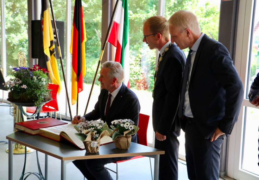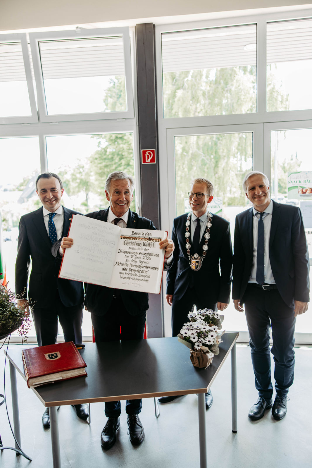 Es waren kleine Gesten, die ihn in Hemer sehr sympathisch machten: Mehrmals kann er über sich selbst lachen, zum anderen schenkte er Marlene, Martin und Samuel erstmal ein Glas Wasser ein, als sie zusammen vor dem Publikum standen, vielleicht auch, um ihnen die Aufregung zu nehmen. Das Schülertrio meisterte seinen Job jedenfalls super und thematisierte unter anderem den Vertrauensverlust in die demokratische Institution, sprach das Mindestalter eines Bundespräsidenten an, das bei 40 Jahren liegt. „Dieses Mindestalter muss sein, der Druck auf das Amt ist extrem, und es fordert zudem eine gewisse Erfahrung“, erläuterte Wulff. Auf die Frage, wie er damals mit dem Druck in der Öffentlichkeit umgegangen sei, gab er zu: „Das war die schwerste Zeit meines Lebens!“ Den Schülerinnen und Schülern gab er mit, dass man sich nie zum Opfer machen, sondern immer die handelnde Person bleiben solle. Bei der Frage, ob es mal ein Gesetz gegeben habe, das er nicht unterschreiben wollte, zeigte er Humor: „Meine Amtszeit war zu kurz.“ Bürgermeister Christian Schweitzer begleitete Christian Wulff, der am Donnerstag 66 Jahre alt wird, zum Eintrag ins Goldene Buch der Stadt Hemer. Wulff staunte, dass sich auch schon Prinz Charles darin verewigt hatte und setzte gerne seine Unterschrift darein. Auch Angela Merkel hat Hemer schon besucht, aber nicht in ihrer Funktion als Bundeskanzlerin.