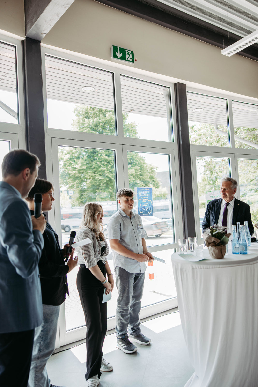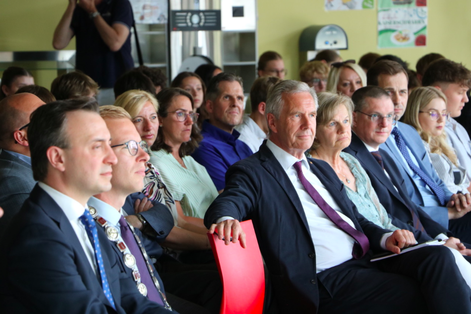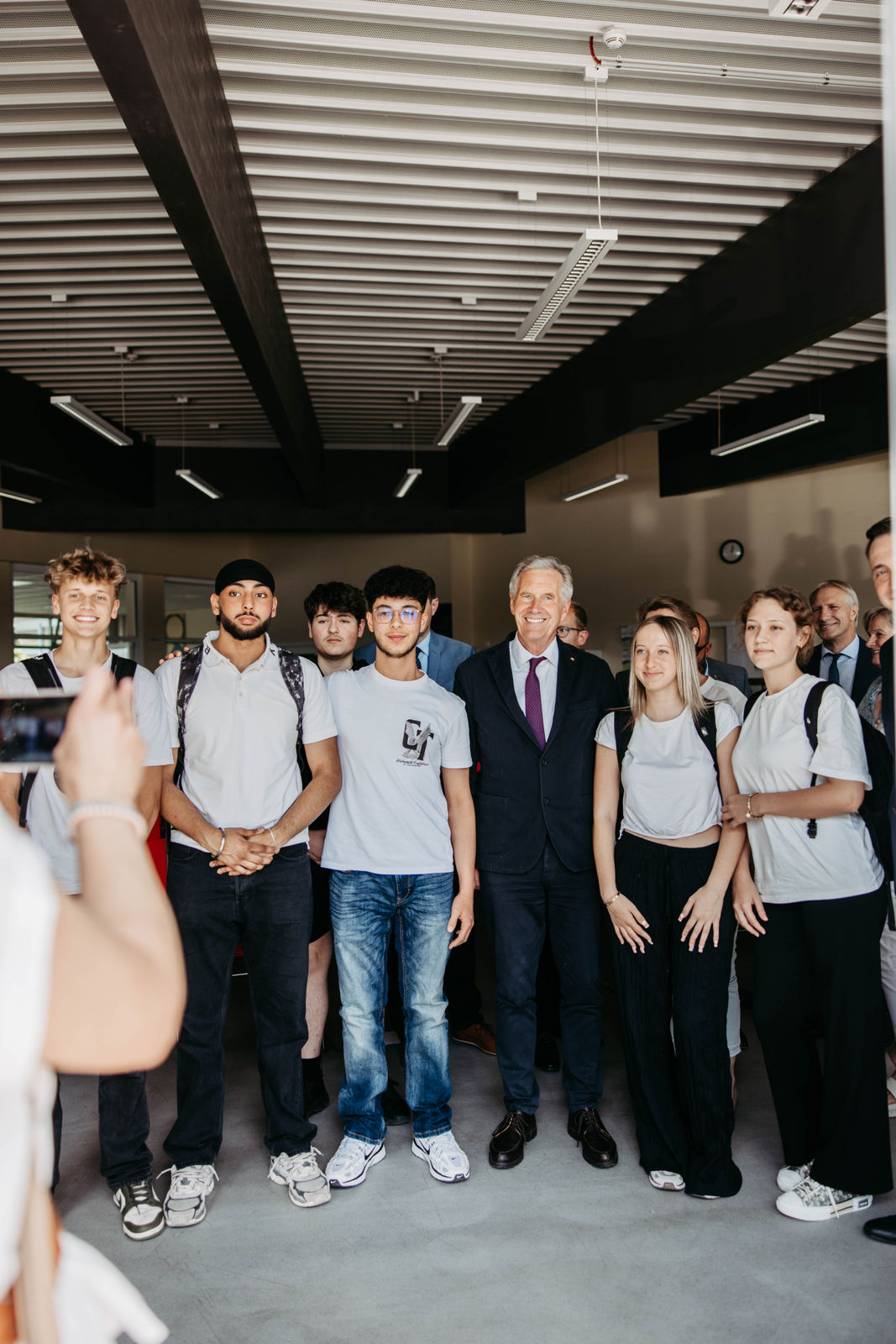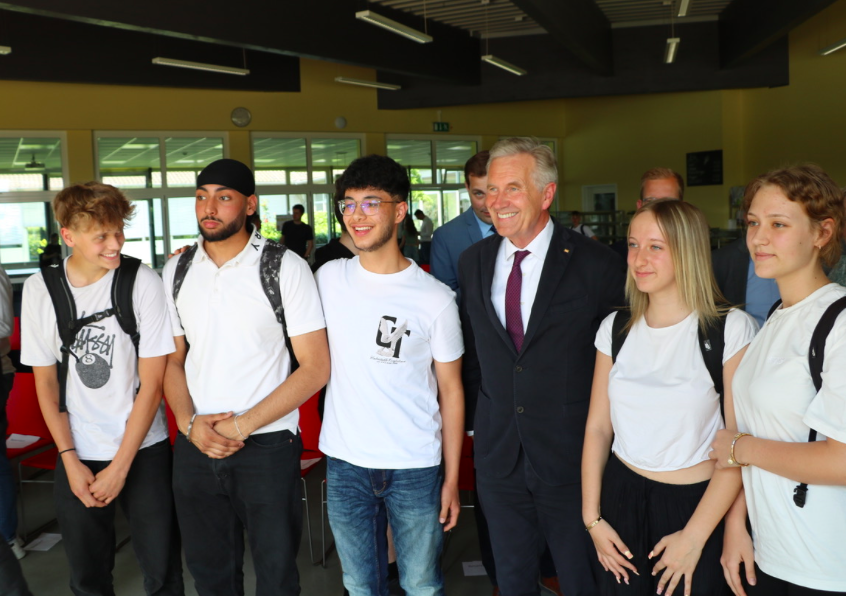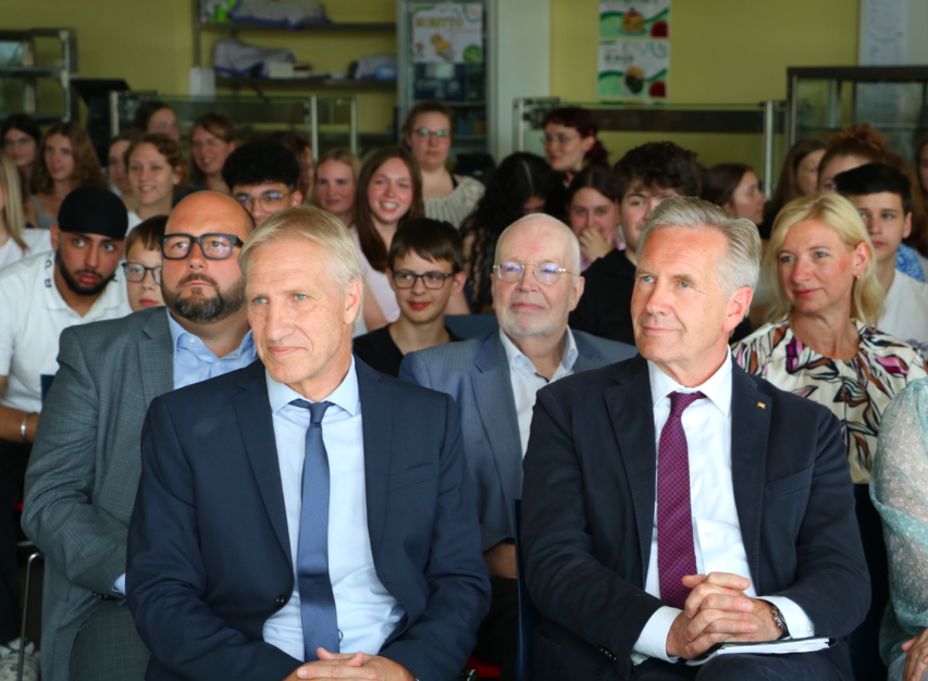 Bürgermeister Christian Schweitzer, Schulleiter Professor Dr. Jörg Trelenberg und Martin Gropengießer als Politiklehrer nahmen Christian Wulff und den Bundestagsabgeordneten Paul Ziemiak in Empfang, und nach einem netten Smalltalk ging es dorthin, wohin es den früheren Bundespräsidenten auch zog: Zu den Schülerinnen und Schülern, die gespannt auf den Besuch des 65-Jährigen gewartet haben. Besonders bei Marlene Jäker und Martin Bauer aus der Klasse 10b und Samuel Obst aus der Stufe 11 dürfte die Nervosität groß gewesen sein, denn sie stellten stellvertretend für ihre Mitschüler und Mitschülerinnen die Fragen, die alle zusammen im Unterricht vorbereitet hatten.