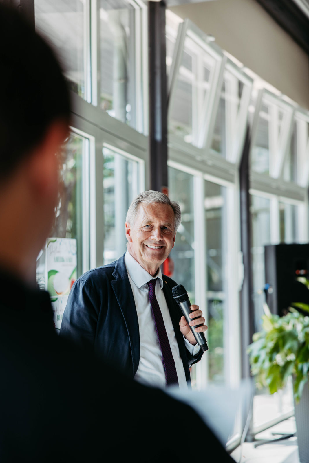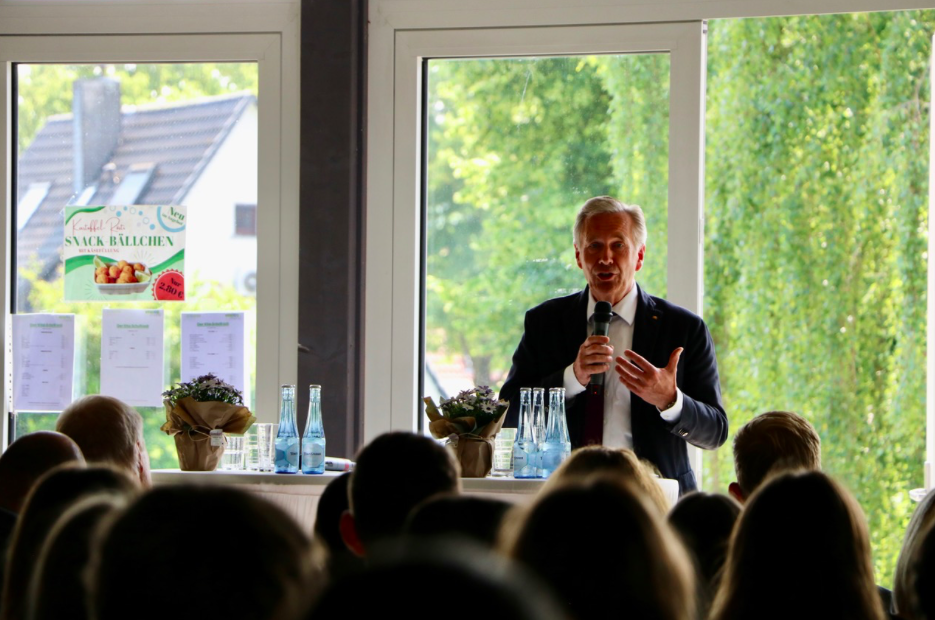 „Es ist uns eine Ehre, heute den ehemaligen Bundespräsidenten Christian Wulff zu Gast zu haben – zu einem wichtigen Thema, mit dem wir uns heute beschäftigen möchten: Aktuelle Herausforderungen der Demokratie. Zweifellos ein Thema, was uns alle und jeden Einzelnen angeht“, sagte Prof. Jörg Trelenberg. „Sie betonen, dass Demokratie keine Selbstverständlichkeit ist. Von Ihnen stammt der Satz: Demokratie klingelt nicht, wenn sie geht. Auf einmal kann sie weg sein. Ein Satz, der nachdenklich macht.“ Dass ein Land, in dem Demokratie gelebt wird, für Wulff sehr wichtig ist, betonte er im Laufe der Veranstaltung immer wieder. „Mit heute 65 Jahren habe ich nur Gutes erlebt. Aufschwung, Freiheit, Rechtsstaatlichkeit, Demokratie, Sozialstaat, europäische Zusammenarbeit. Der Höhepunkt meines Lebens ist die deutsche, die europäische Einheit und ununterbrochen innerer und äußerer Frieden. Das hat es inzwischen 80 Jahre lang noch nie auf deutschem Boden gegeben, und das sollte uns klarmachen, dass es keineswegs selbstverständlich ist“, sagte der Bundespräsident a.D. Er sei sehr dankbar und der Meinung, dass man dafür Sorge tragen müsse, dass die junge Generation ein Leben möglichst unter den Bedingungen leben könne, wie es beim ihm der Fall gewesen sei und nicht unter den Bedingungen, wie seine Eltern und Großeltern es erlebt hätten. „Je länger ich Politik mache, desto mehr mache ich mir Sorgen, dass Menschen nicht genug lernen aus der Geschichte, sondern immer wieder zurückfallen in bestimmte Verhaltensweisen, die dann irgendwann wieder zu Kriegen oder zu Auseinandersetzungen führen“, sagte er. Er glaubt, dass die Entwicklung des Friedens und der Demokratie in der Europäischen Union in Gefahr sei. Er appellierte an die Jugendlichen, sich für Deutschland einzusetzen, sich einzubringen und zu engagieren. „Sie werden immer wieder feststellen, dass die Menschen darüber entscheiden, welche Entwicklung das Land nimmt.“ Christian Wulff ist mit Bundesverteidigungsminister Boris Pistorius zur Schule gegangen und noch heute mit ihm befreundet, er hat im Jahr 2011 Margot Friedländer das Bundesverdienstkreuz verliehen. Er sieht das Internet als eine Möglichkeit zur Information, warnt aber gleichzeitig vor Fehlinformation. „ChatGPT denkt, ich habe nur eine Tochter. Aber ich habe auch einen Sohn.“ Und die Frage, wie oft er nun eigentlich verheiratet gewesen ist, könne das Internet auch nicht richtig beantworten. Generell sei es aber wichtig, sich eine Meinung bilden und den Mut zu haben, diese Meinung auch zu vertreten, betonte er.