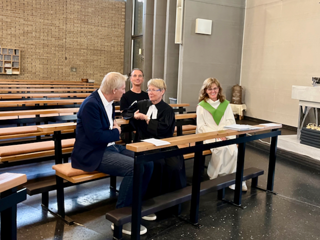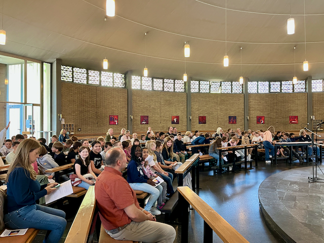 das war das Motto des diesjährigen Einschulungsgottesdienstes der Stufe 5, der wie immer sehr adressatengerecht und liebevoll vom Lehrerteam Natascha Kreft und Ralf Micha vorbereitet und von der Gemeindereferentin Jasmin Rifert-Plogmann in Kooperation mit Pfarrerin Gaby Bach in der Christ-König-Kirche geleitet worden war. Aufhänger war die Emmausgeschichte aus dem Lukasevangelium: Von Ratlosigkeit und Trauer geplagt reisen zwei Jünger Jesu nach dessen Tod nach Emmaus. Unterwegs begegnen sie einem geheimnisvollen Fremden. Sie erzählen ihm von Jesu Tod, dessen Verschwinden, ihrer Trauer, und sie laden ihn zum Abendessen ein. Als er mit ihnen das Brot bricht, erkennen sie in dem Fremden plötzlich Jesus, der sogleich verschwindet. Überwältigt und glücklich kehren die beiden Jünger nach Jerusalem zurück, um von der Erfahrung zu erzählen. Es ist eine Geschichte, die zeigt, dass man sich in Traurigkeit und Verzweiflung verlieren kann, aber auch, dass wir immer in Gottes Gesellschaft sind und diese uns Hilfe, Mut und Zuversicht spendet. ![]() Viele Kinder haben die Grundschule schweren Herzens verlassen und empfinden nun, zu Beginn der 5. Klasse an der neuen, weiterführenden Schule Unsicherheit. Aber wie Gott zu den Jüngern gekommen ist und ihnen wieder Mut und Zuversicht verliehen hat, so ist Gott auch bei den Fünftklässlern in ihrem neuen Lebensabschnitt. Begleitet wurde dieser Abschnitt des Gottesdienstes unter anderem von Liedern wie „Wo zwei oder drei in meinem Namen versammelt sind“ und „Halte zu mir, guter Gott“, die mit großer Begeisterung und auch Lautstärke unter der Anleitung von Jörg Segtrop geschmettert wurden.