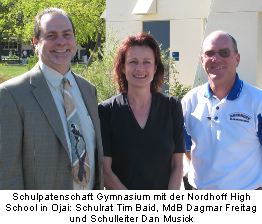 Woeste-Gymnasium startet Schüleraustausch mit High School in OjaiMit freundlicher Genehmigung aus dem Internet-Auftritt des IKZ übernommenHemer/ Ojai.Mit dem Oldie „California dreamin” wurden die Bilder von Orangenplantagen, Stränden der Pazifikküste, Attraktionen in Los Angeles und San Francisco untermalt. Für 18 Gymnasiasten und zwei Lehrerinnen wird der kalifornische Traum im Herbst wahr. ![]() Das Woeste-Gymnasium startet eine neue Schulpartnerschaft mit der Nordhoff High School in Ojai. Schon seit Jahren bemüht sich das Gymnasium um eine weitere englischsprachige Partnerschule, hat man doch beste Erfahrungen mit den Schülerbegegnungen in Coventry, Beuvry und Schelkowo gemacht. „Wir wollen deutliche Akzente im sprachlichen Bereich setzen”, betont Schulleiter Eckardt Lüblinghoff. Das Angebot an Fremdsprachen, dem bilingualen Zweig, Fremdsprachenwettbewerben, Zertifikaten und internationalen Begegnungen soll daher um einen Baustein erweitert werden. In Großbritannien wurde man nicht fündig, dafür aber durch Kontakte der Bundestagsabgeordneten Dagmar Freitag in den USA. Die heimische SPD-Abgeordnete betreut über das Parlamentarische Partnerschaftsprogramm des Deutschen Bundestages regelmäßig Schüler in den USA und lernte so auch die Schule in Ojai kennen. Die Verbindungen zum Schulleiter Dan Musick stellte der in San Francisco lebende deutsche Journalist Arndt Peltner her, dessen Frau aus Ojai stammt. So waren Dagmar Freitag und Arndt Peltner gestern am Woeste-Gymnasium zu Gast, um die Schüler über die Nordhoff High School und Kalifornien zu informieren. Das rund 8000 Einwohner große Ojai ist eine Kleinstadt etwa 110 Kilometer nordwestlich von Los Angeles und nur etwa 20 Kilometer von der Küste entfernt. Die öffentliche High School des Districts hat rund 1000 Schüler. Beeindruckt zeigte sich Dagmar Freitag von der Ausstattung, den perfekten Sportanlagen. Ende Mai wird sie im Rahmen des Austauschprogrammes des Bundestages den Schülern in Ojai das Woeste-Gymnasium und Hemer vorstellen. Schulleiter Dan Musick schwärmt