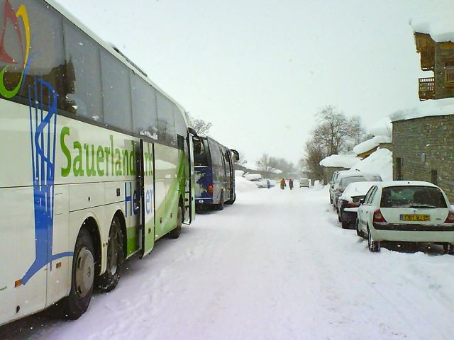 ![]() Wie durch den Wetterbericht angekündigt, hat in den Morgenstunden zunächst leichter Schneefall eingesetzt. Die Busse wurden schon gestern mit Schneeketten ausgerüstet. ![]() Angesichts des stärker werdenden Schneetreibens sind alle über die Entscheidung froh, die Abreise einen halben Tag vorverlegt zu haben. Später werden wir von der Nachhut (Cathrin Barthelmes, Arne Henneman, Markus Nau und Sabine Schach) telefonisch erfahren, dass die Ausfallstraße aus Bonneval im Laufe des Nachmittags gesperrt und erst wieder am Samstagmorgen geöffnet werden wird. Auf die Abreise müssen wir eine