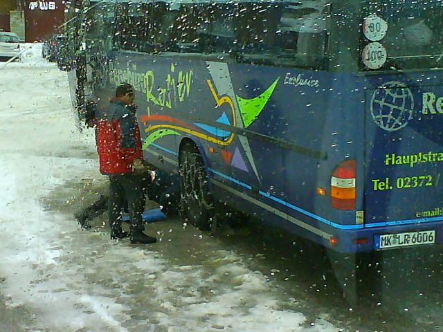 Reihe kleinerer Beanstandungen etwas hinzieht: Hier fehlen Besteckteile, dort ein oder zwei Gläser. Eine Latte in einem Bettrost ist durchgebrochen, das eine oder andere Klo verstopft und nicht jeder Kühlschrank gereinigt. In manchen Regalen lagern noch unverbrauchte Lebensmittel, eine Reihe von Kopfkissen sind nicht abgezogen, zwischen der Bettwäsche finden sich T-Shirts, Hemden, Unterhosen ...; na ja, das Übliche! Schließlich können alle Unstimmigkeiten beseitigt werden. Laurent und seine Frau Nathalie sind nicht schwer zufrieden zu stellen, weil sie für die Tage nach unserer Abreise ohnehin eine Generalreinigung des Hauses vorgesehen haben. Im Rahmen der Abschlussbesprechung wird zwischen der Fahrtenleitung und Laurent geklärt, dass das Chalet „La Marmotte“ dem Woeste-Gymnasium im nächsten Jahr wieder zur Verfügung stehen wird, wenn es erneut eine Skifahrt nach Bonneval durchführen möchte. Das ist eine gute Nachricht für alle Schüler, die sich jetzt in der Stufe 9 befinden. ![]() Insgesamt verläuft die Rückfahrt nach Hemer weitgehend problemlos. Schwierigkeiten macht nur das Entferrnen der Schneeketten am blauen Bus. Als sich die Ketten in den Zwillingsreifen verkeilen, ist zunächst guter Rat teuer. Aber Busfahrer Fritz (hier nicht im Bild) kann seinem Kollegen schließlich aus der Patsche helfen. Und danach singen die Reifen das Hemer-Lied ... |