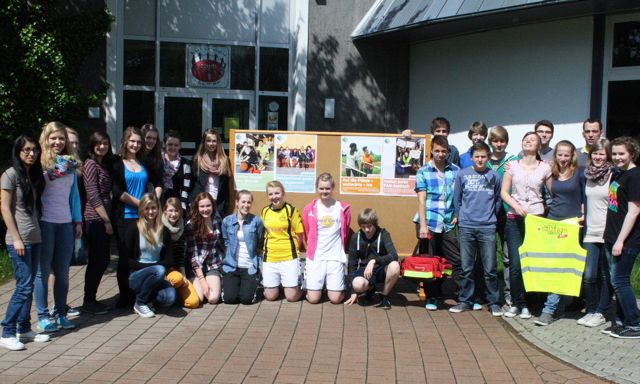 Der Schulsanitätsdienst geht weit über Erste Hilfe hinaus: Schulsanitäter übernehmen Verantwortung für ihre Mitschüler. Sie sind bei Unfällen in der Schule oft als erste zur Stelle, leisten zusammen mit Lehrkräften und Sekretärinnen Erste Hilfe und informieren wenn nötig den Rettungsdienst. Das sind wichtige Aufgaben, die Wissen und Einfühlungsvermögen, aber auch Selbstbewusstsein und Teamarbeit erfordern. ![]() „Woeste-Schulsanis”