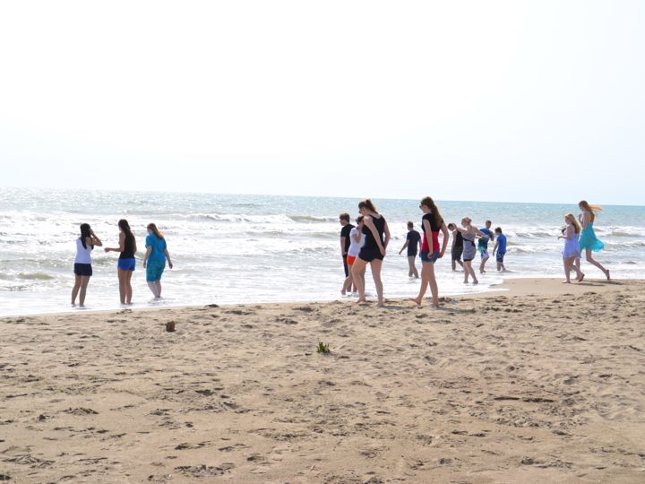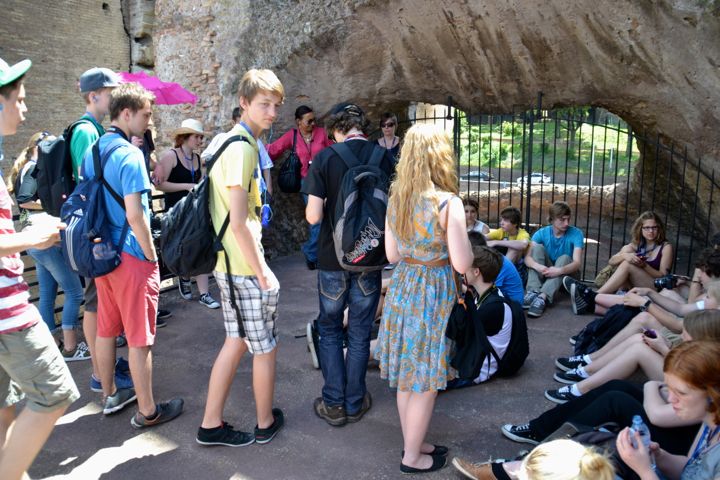 ersten Gang zum nahegelegenen Strand genutzt.![]() Der erste Programmtag ist geprägt vom antiken Rom: Forum Romanum, Kaiserforen, Kapitol und das flavische Amphitheater – besser bekannt als „Kolosseum“ – sind die wesentlichen Punkte der geleiteten Besichtigungstour, auf der die Gruppe all die geschichtsträchtigen Orte und Gebäude, über die die Schülerinnen und Schüler an den Vorbereitungsabenden und im Unterricht bereits vieles erfahren haben, mit eigenen Augen sehen kann – oder zumindest das, was davon übrig ist. Auch interessante Details weiß die aus Österreich stammende Touristenbegleiterin zu vermitteln: über die Qualität des römischen Wassers, das an vielen Brunnen in der Stadt angeboten wird, über die mittelalterliche „Fälschung“ der berühmten Wölfin mit Romulus und Remus und allerlei unausrottbare historische Irrtümer oder Berlusconis Auffrischung der Nationalfarben am Nationaldenkmal. Erfüllt von diesen ersten Eindrücken geht es wieder mit dem Regionalzug aus der Großstadt ins kleine Ardea zurück. Am
