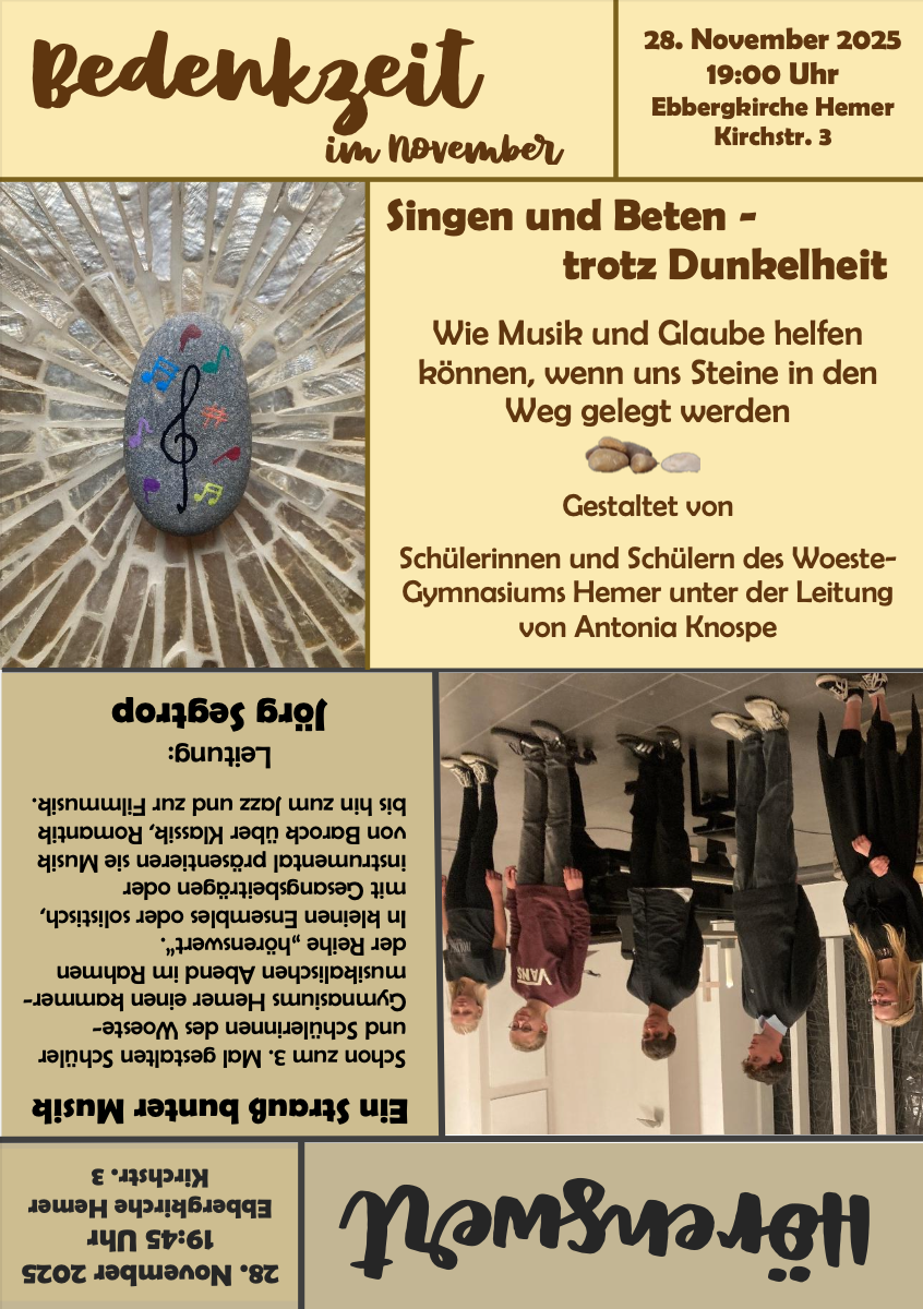 Am Freitag, dem 28.11.2025, fanden in der Ebbergkirche eine Andacht und ein Kammerkonzert des Woeste-Gymnasiums statt. Einige Wochen zuvor hatte sich Frau Knospe schon mit dem evangelischen Religionskurs 8b/d zusammengesetzt und die Andacht, die unter dem Motto „Musik“ stand, aufwendig vorbereitet. Von den Schülerinnen und Schülern wurden im Unterricht Gebete, Fürbitten und vieles mehr geschrieben und vor der Klasse vorgetragen, sodass die Andacht sehr gut vorbereitet war. Am Freitag war es nun soweit und die 8b/d und Frau Knospe haben gezeigt, was sie so kreativ vorbereitet hatten und dies auch mit Erfolg. Die Schülerinnen und Schüler hatten sehr viel Spaß beim Vortragen der Gebete und Fürbitten und nach einem guten Zuspruch von Frau Knospe war die Nervosität direkt vergessen. Nachdem die Andacht vorbei war, ging es zum zweiten Teil des Abends über, dem Kammerkonzert. Die Musikerinnen und Musiker konnten alle mit ihren vorgetragenen Stücken verzaubern, weshalb alle Anwesenden gespannt zuhörten. Es war ein schöner Abend voller musikalischer Eindrücke und der Religionskurs 8b/d hat sich sehr gefreut, dabei gewesen zu sein und hofft, schon bald wieder bei einer Andacht oder einem Gottesdienst helfen zu können. Text: Hayden Kayleigh Whittington, 8d